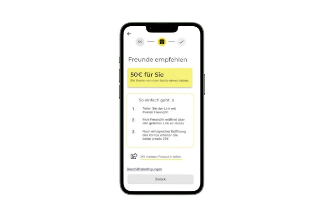 Versenden Sie den Weiterempfehlungscode an Freund:innen und Bekannte. Sobald das neue Konto erfolgreich online eröffnet worden ist, wird die Prämie ausgezahlt. Die Prämie gilt nur für Online-Kontoeröffnungen.