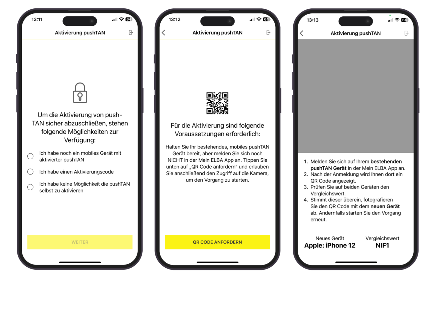 1. Mit QR-Code: Den QR-Code finden Sie in der Mein ELBA-App auf Ihrem alten Handy, also Ihrem bisherigen pushTAN-Gerät. Scannen Sie den QR-Code mit Ihrem neuen Handy, um die Aktivierung abzuschließen.
