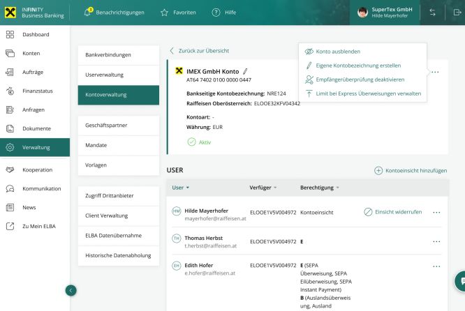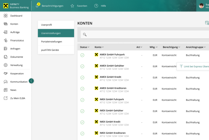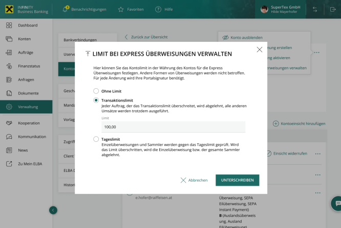 Mit Raiffeisen INFINITY passen Sie Ihre Zahlungs‑ und Transaktionslimits einfach selbst an. Die Limitänderung erfolgt online und transparent – direkt im System und ohne zusätzlichen Papieraufwand.