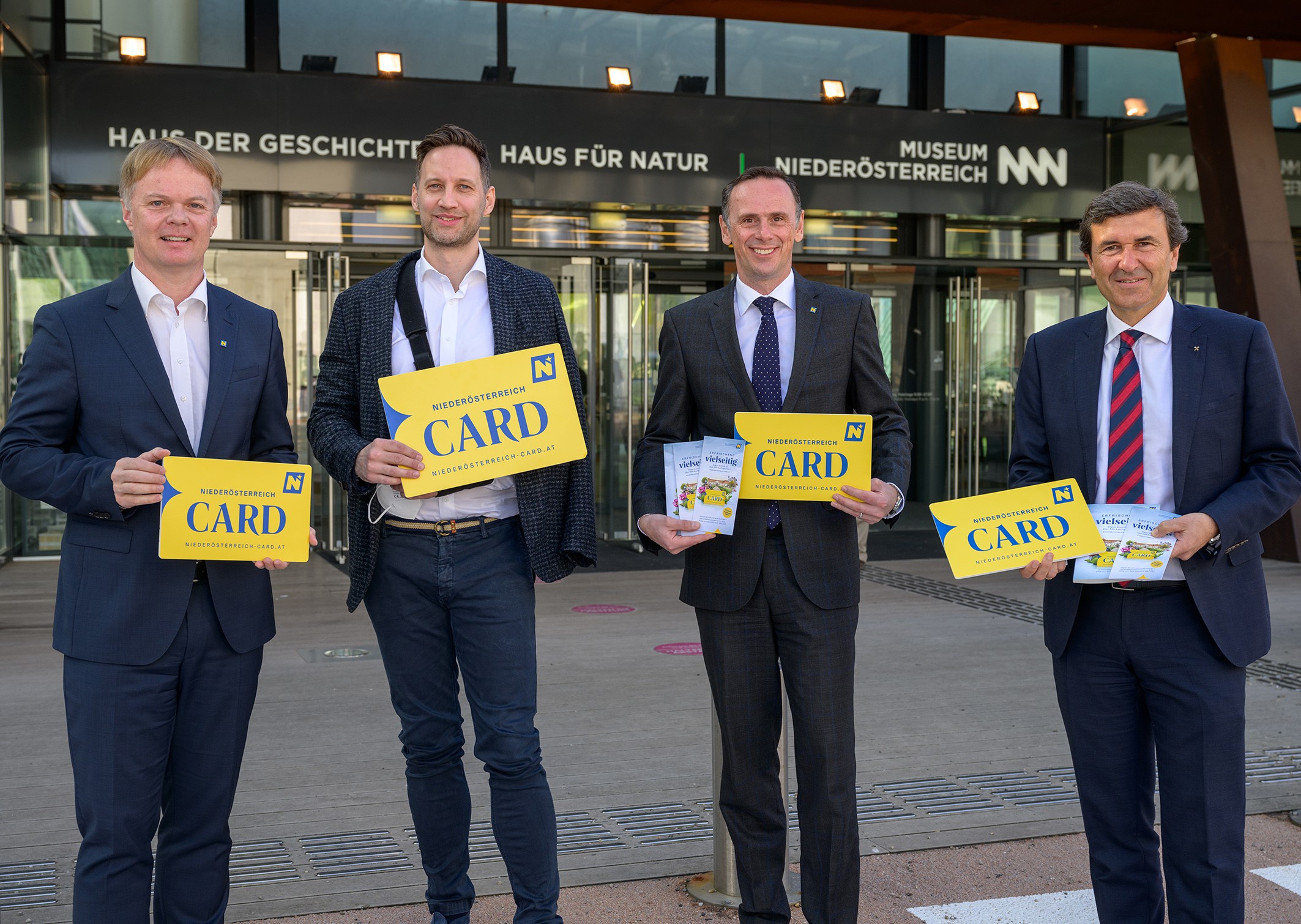 Foto (Credit: NLK Buchhart): Michael Duscher – Geschäftsführer der Niederösterreich Werbung, Klemens Wögerer – Geschäftsführer der Niederösterreich-CARD, Tourismuslandesrat Jochen Danninger, Reinhard Karl - Generaldirektor-Stv. der Raiffeisenlandesbank Niederösterreich-Wien