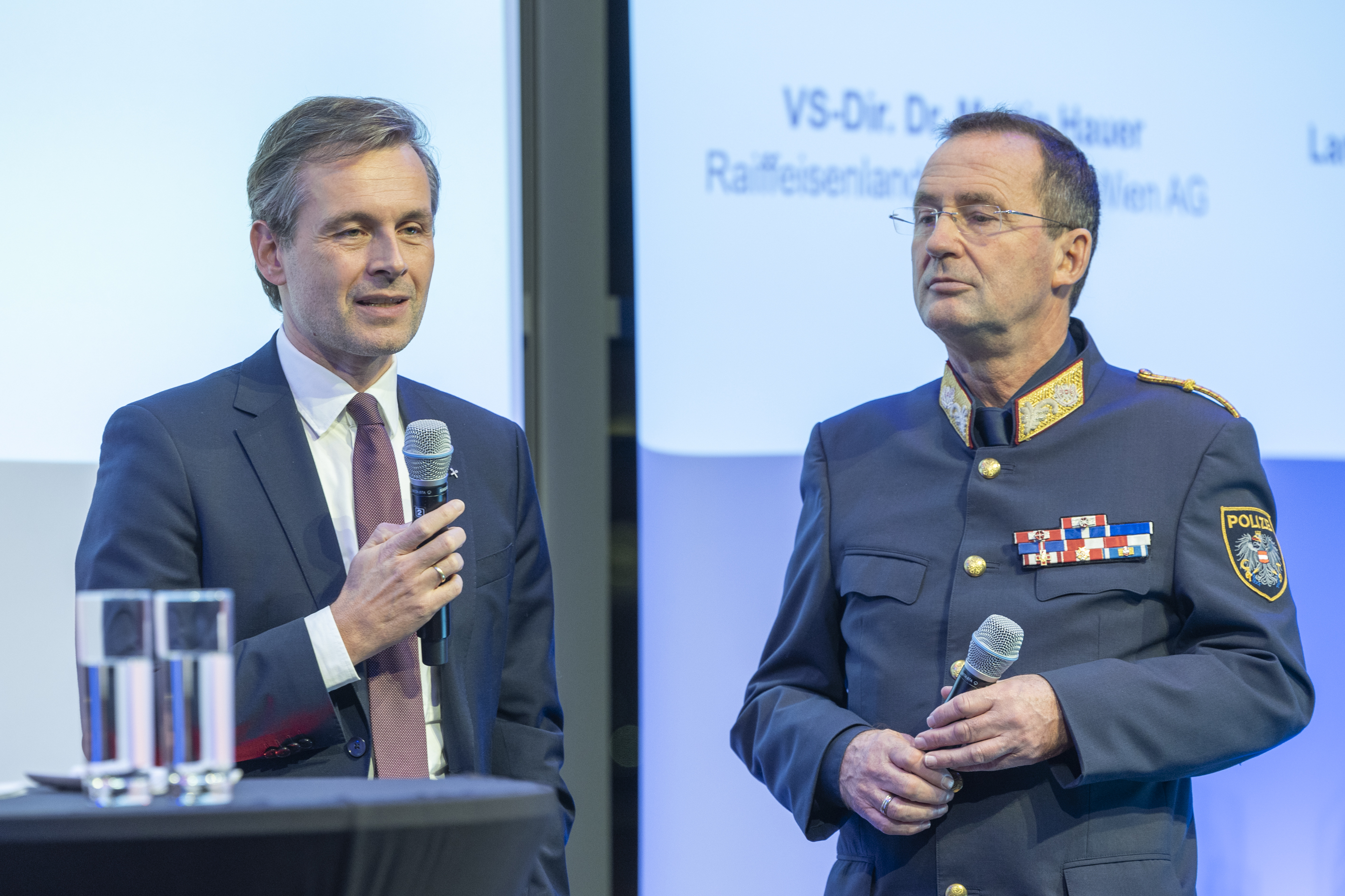 Bild 2: Martin Hauer (l.), Vorstand der Raiffeisenlandesbank NÖ-Wien, und Gerhard Pürstl (r.), Landespolizeipräsident Wien, gratulierten den Preisträger:innen.