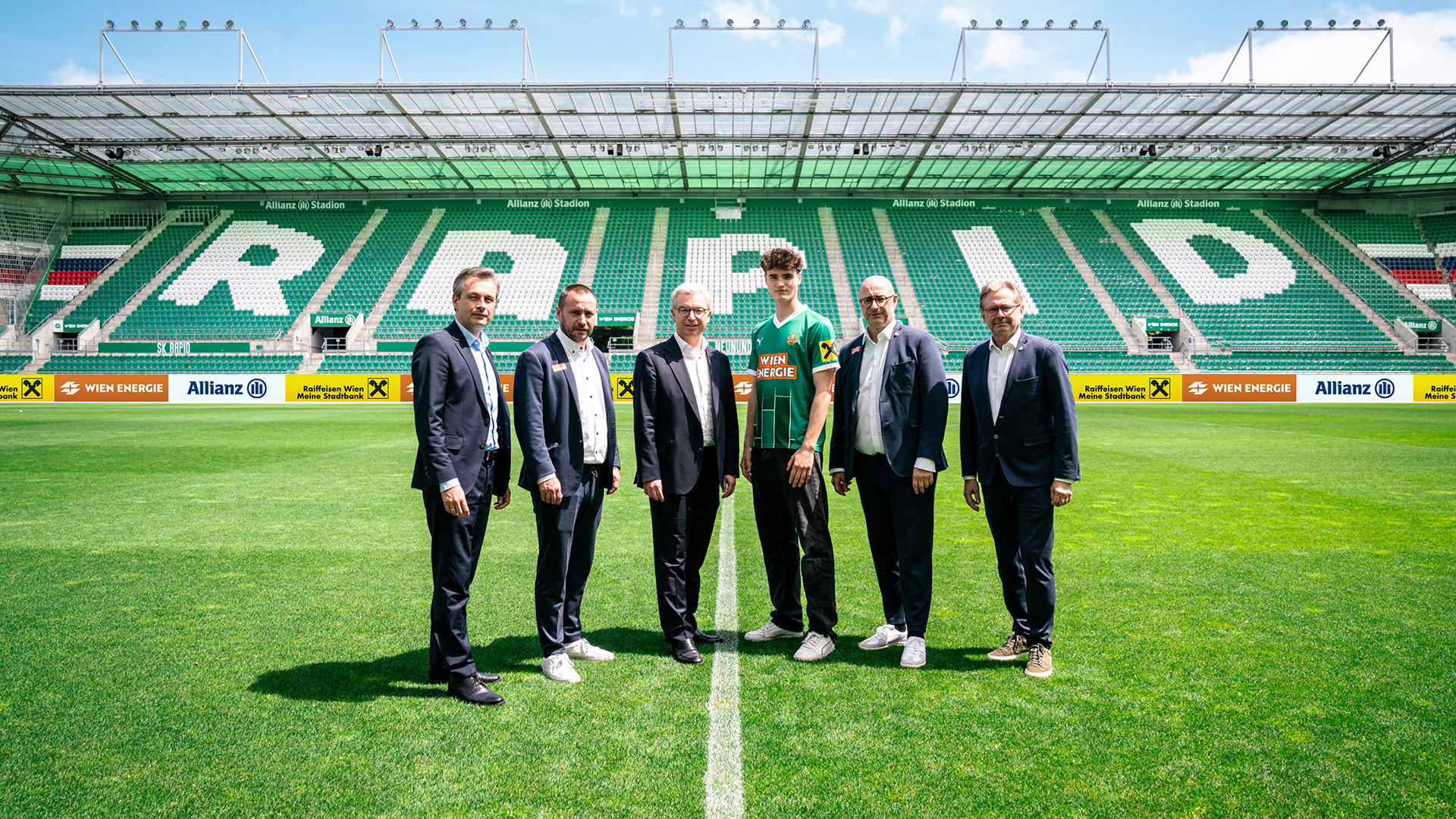 Pressefoto zum Download v.l.n.r.: Vorstandsdirektor Martin Hauer, Rapid-Geschäftsführer Steffen Hofmann, Generaldirektor Michael Höllerer, Rapid-Profi Nikolas Sattlberger, Geschäftsführer Marcus Knipping sowie Präsident Alexander Wrabetz.