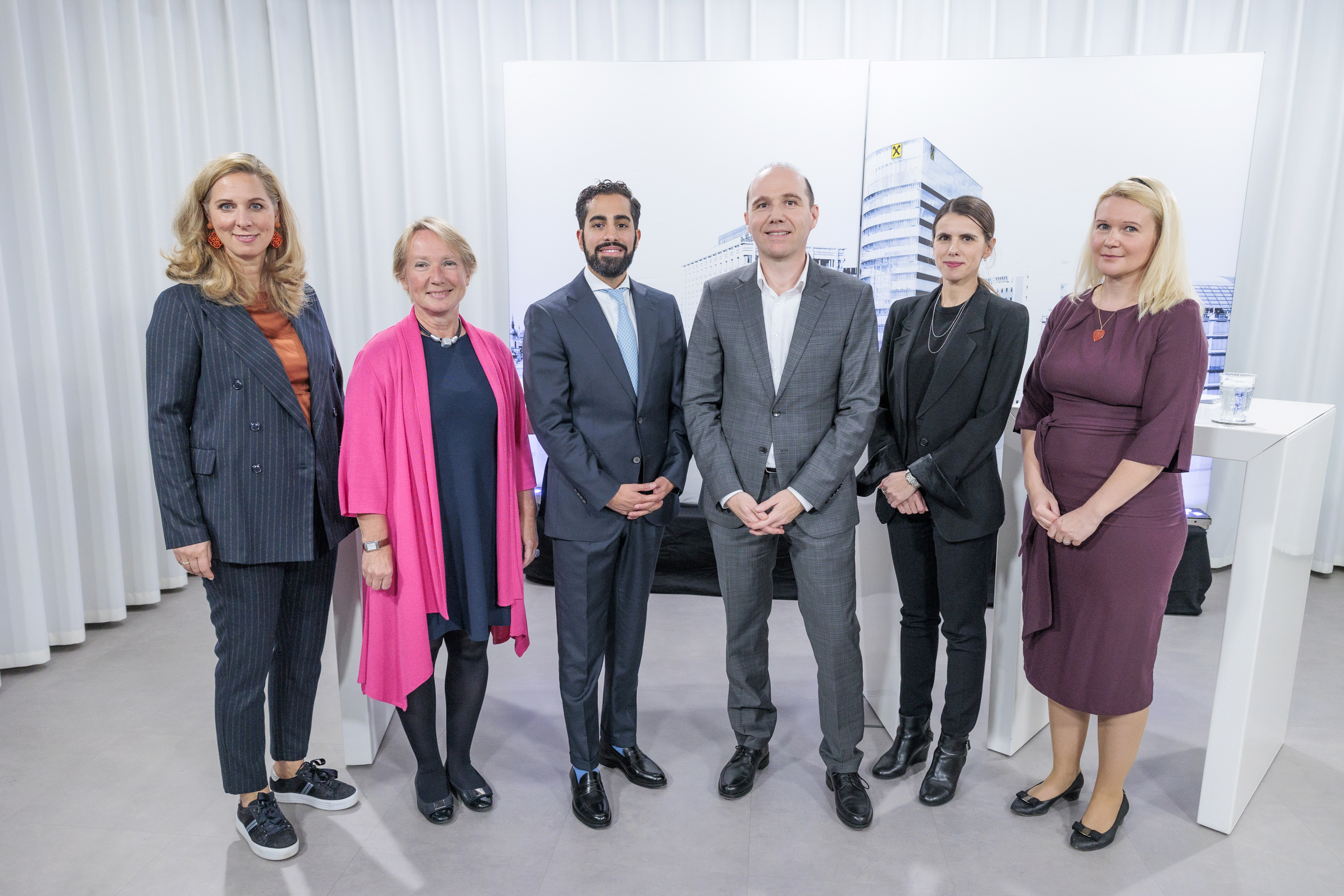 Im Bild (Credit: Roland Rudolph) v.l.n.r.: Daniela Uhlik-Kliemstein (Leiterin Zentrale Bankenbetreuung der Raiffeisen Capital Management), Heike Arbter (Vorstandsmitglied Raiffeisen Centrobank), Omid R. Alimohammadi (Vize-Präsident BlackRock), Markus Plank (Leiter Wertpapierkompetenzzentrum der Raiffeisenlandesbank NÖ-Wien), Alina Brunner (Projektleiterin Raiffeisenlandesbank NÖ-Wien), und Larissa Kravitz (Gründerin Investorella)