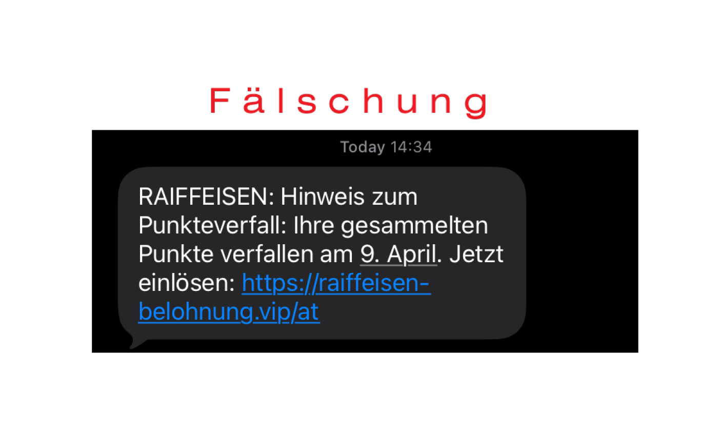 "RAIFFEISEN: Hinweis zum Punkteverfall: Ihre gesammelten Punkte verfallen am 9. April. Jetzt einlösen: http://raiffeisen-belohnung.vip/at (bzw. alternativer Link: https://raiffeisen-einlosen.vip/at)"