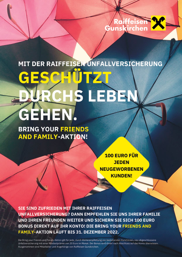 Sie sind zufrieden mit Ihrer Raiffeisen Unfallversicherung und genießen den vollen Schutz der privaten Unfallvorsorge. Dann empfehlen Sie uns Ihrer Familie und Ihren Freund:innen weiter und sichern Sie sich 100 € Gutschrift direkt auf Ihr Konto mit unserer Bring your Friends and Family-Aktion.