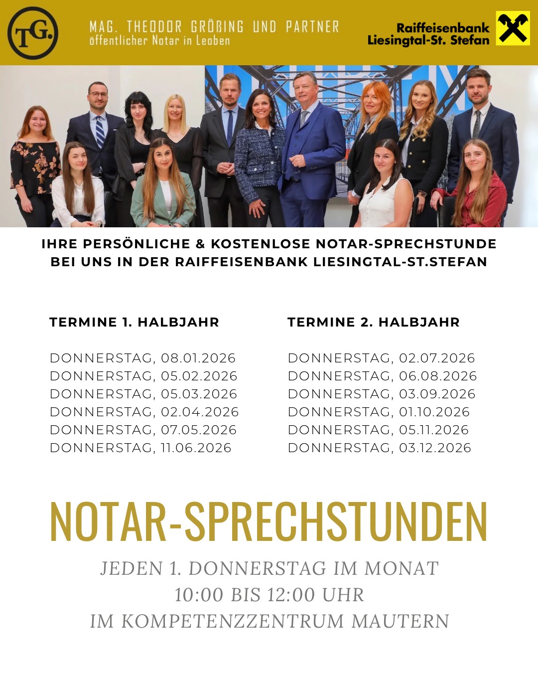 Bitte um Voranmeldung im Notariat oder bei der Raiffeisenbank Liesingtal-St. Stefan